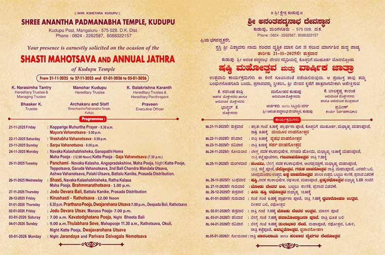 ಕುಡುಪು ಶ್ರೀ ಅನಂತ ಪದ್ಮನಾಭ ದೇವರ ವೈಭವದ ಷಷ್ಠಿ ಮಹೋತ್ಸವ ಸಹಿತ ಸಪ್ತೊತ್ಸವ